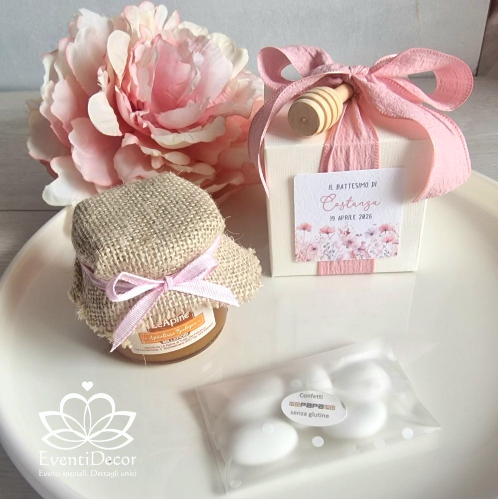 Bomboniera con miele, spargimiele e grafica fiorellini rosa cipria